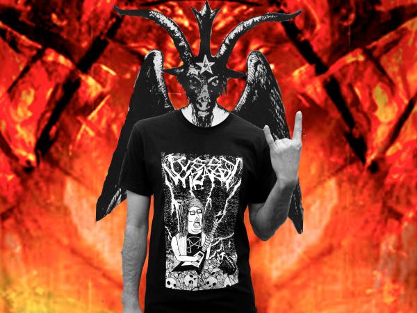 Faces are melted. Souls are sold. Look like this tiny-headed devil by rocking what will surely be the metalest shirt you own by a band named after magical cats.